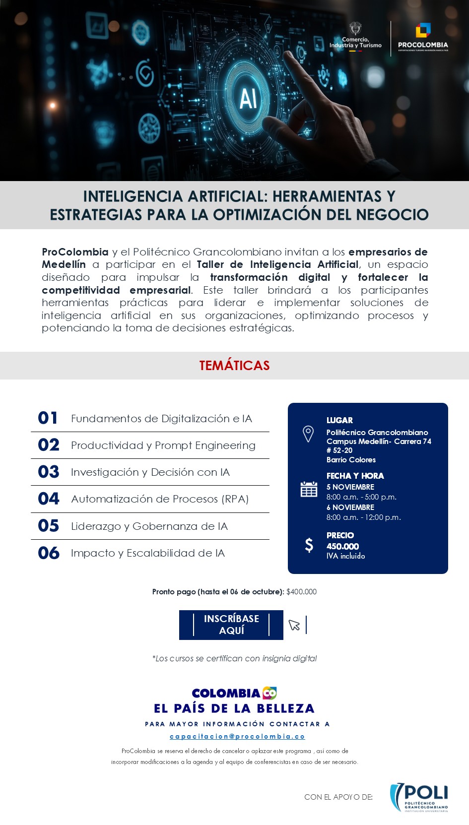 Empresarios y directivos de Procolombia en la ciudad de Medellín, así como a mandos medios y personal operativo del sector, que buscan comprender e implementar la Inteligencia Artificial para optimizar procesos y mejorar la productividad de sus organizaciones.